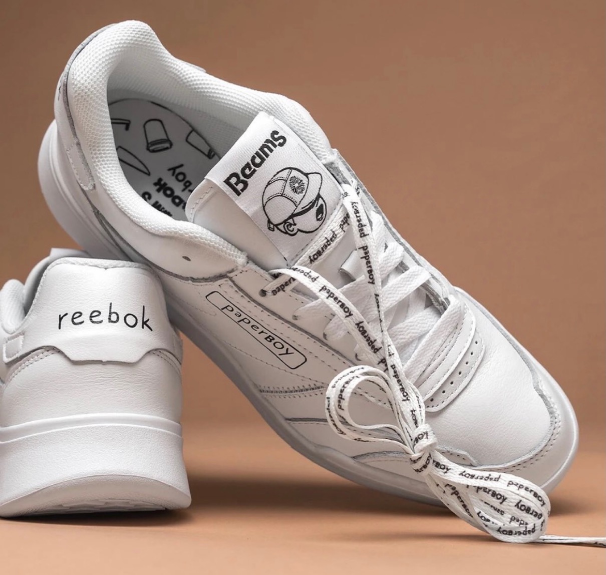 シャープでクリーンで万能、このスニーカーはどんなルックにもぴったりマッチするホワイトカラー。フランスの人気カフェのペーパーボーイと日本のビームスが、リーボックのクラブシーレガシーに独自のテイストをプラス。サプルレザーのアッパーには遊び心あるディテールがふんだんに落とし込まれ、ペーパーボーイのシュータンロゴや、3者のネームがプリントされたインソール、ヒールのペーパーボーイフォントで表現した手書きの「Reebok」ロゴなど、シンプルかつアイコニックな一足に仕上げられている。