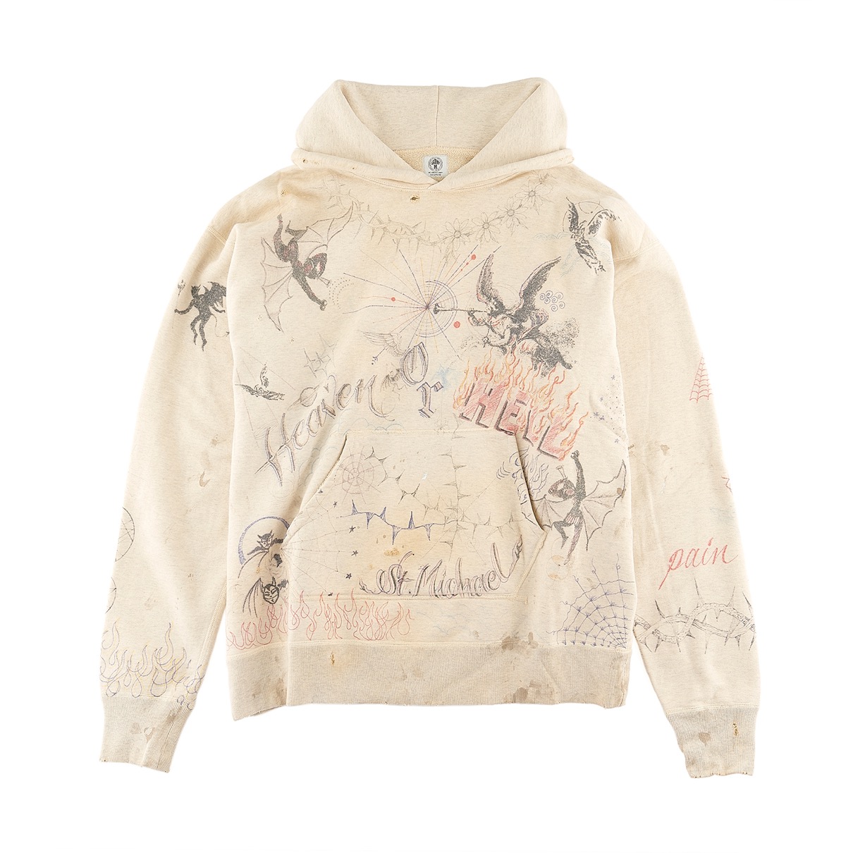 両者にとって初のコラボレーションとなる今回は、©SAINT M××××××のラインナップの中でも高い人気を誇る落書き風プリントフーディーを共同で制作。世界的な人気を誇るDr. Wooらしい繊細なタッチの作品を、Dr. Woo自らがフーディー原寸大の型紙に描き、その独特な風合いを活かしてフーディーに転写プリントを行った。