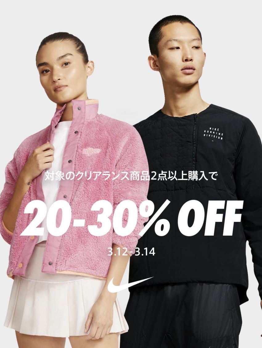 ナイキ公式オンラインでセールアイテムが更に20~30%OFFになるクリアランスキャンペーンが、2021/3/12(金)~2021/3/14(日)まで実施中です。