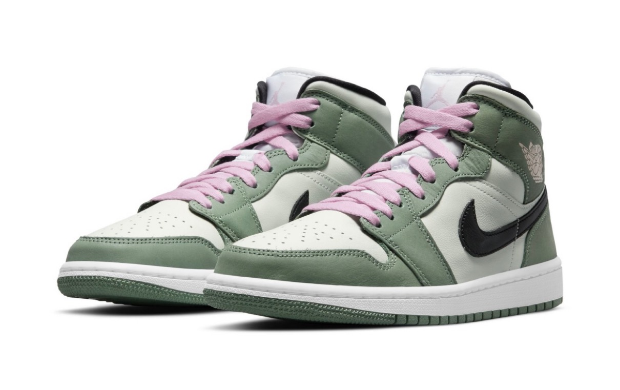 1985年に初めて発売され、生誕35周年を迎えた今もなおカルト的人気を誇るスニーカー「AJ1(エアジョーダン1)」。本作ではミッドカットモデルをベースに、淡いベアリーグリーンカラーでアッパーを構築。オーバーレイには同系色で少し濃くなったダッチグリーンを使用し、ライナーやサイドのスウッシュロゴはブラックカラーを採用することによってシューズ全体のデザインを引き締めた。また、シュータンのジャンプマンロゴやシューレースにはピンクカラーを落とし込み、違和感のないアクセントとなっている。
