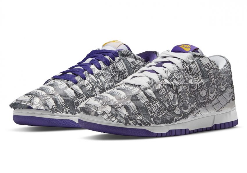 アッパー全面には薄葉紙が巻かれており、これを破くことによってアッパーがお披露目されるというギミックを搭載。ホワイト/パープルの左右非対称カラーが落とし込まれる本作では、1999年に日本限定で登場した“City Attack” Packの名作カラーを復刻。右足には表ダンク、左足には通称“裏ダンク”と呼ばれた反転カラーリングを落とし込み、サイドのスウッシュロゴやシュータンラベル、ヒールパッチのロゴまでも反転。また、両足ともオーバーレイにはオーストリッチレザーが使用され、インソールとアッパー薄葉紙には「BE TRUE TO YOUR SCHOOL」の手描き風グラフィックがプリントされる。当時からのファンはもちろん、現代のスニーカーフリークも賑わせる垂涎のディテールを備えた一足だ。