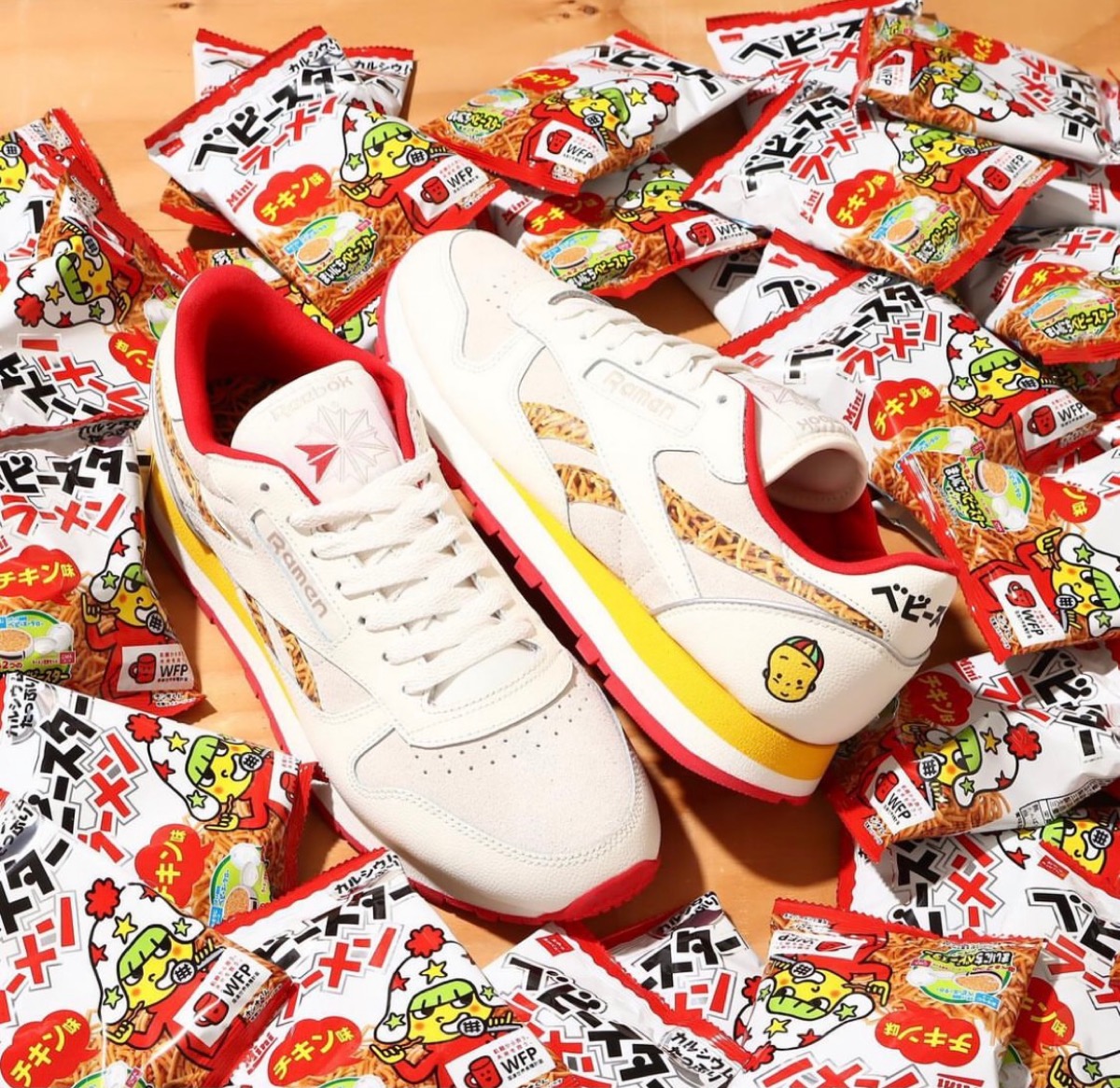 おやつカンパニー ベビースターラーメン × アトモス × リーボック による異色のトリプルコラボスニーカー『クラシックレザー』が登場。[HP3242]