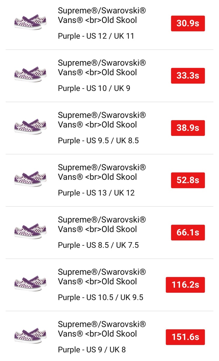 最速で完売したアイテムは、日本ではWeek12にあたる11月19日(土)に発売予定のVans × スワロフスキー Old Skool パープルカラー US12サイズで30.9秒。