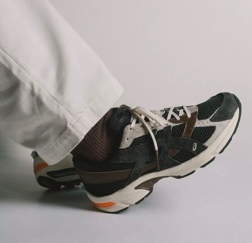 HAL STUDIOS x ASICS GEL-1130 MK II “フォレスト”は、ブラック メッシュやフォレスト グリーンのスエード パネル、ブラウン レザーを組み合わせてアッパーを構築。このシューズの色合いは、信仰の場であり、神道の神々の本拠地である日本の神社からインスピレーションを得ている。メインカラーのグリーンは周りの森を、茶色く染まったアグレットは泥をイメージし、着想源となった土地の本質を捉えている。また、ヒールとレザーインソールにネオンオレンジが映え、ブランドの“マインドフル”なムード ボードを伝えてくれる。