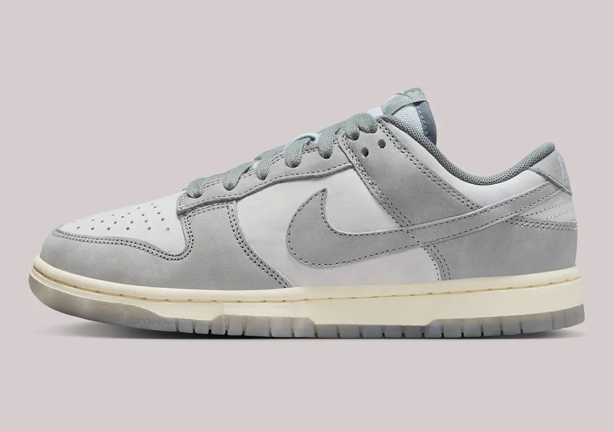 ナイキから1985年に初リリースされた「ダンク(Dunk)」。今回登場するのは、アッパーにフットボールグレー/クールグレーのヌバック素材を纏った一足。ミッドソールにはヴィンテージ感を演出するココナッツミルクカラーが使用されており、半透明のクリアアウトソールとシュータンラベルはムラのあるカラーで仕上げている。