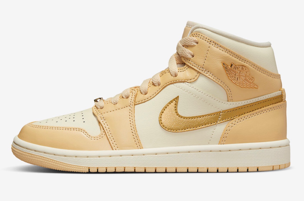 1985年に初めて発売され、現在も高い人気を誇るスニーカー「Air Jordan 1(エアジョーダン1)」。本作ではミッドカットSEモデルをベースとし、セイルのレザーアッパーにペールバニラのオーバーレイを組み合わせ、アンクルフラップのウィングロゴやサイドのスウッシュなど、随所にメタリックゴールドのアクセントでゴージャスな雰囲気をプラスしている。
