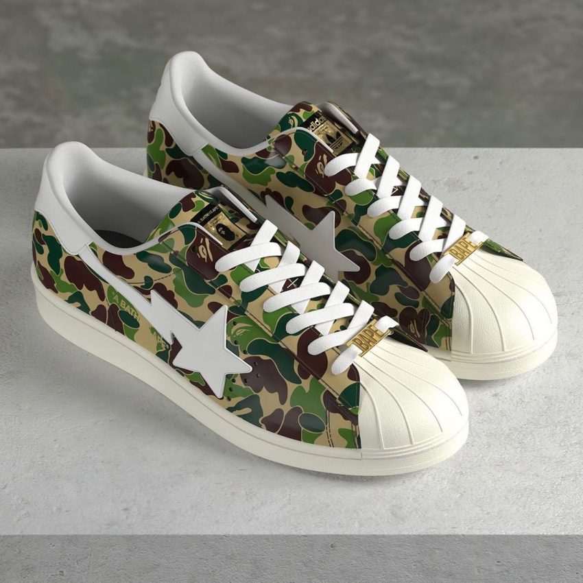 BAPEを象徴するABC-CAMO柄があしらったレザー素材のアッパー、右側にBAPE STA・左側にスリーストライプスが左右非対称に配置されたサイドパネル、BAPEのロゴが型押されたゴールドのシューレースアクセサリー、両ブランドのロゴが配置されたバックタブ、ア・ベイシング・エイプのブランド名が先端に配置されたシューレース、ABC-CAMO柄のシューズボックスなどのデザインが特徴的なモデルです。