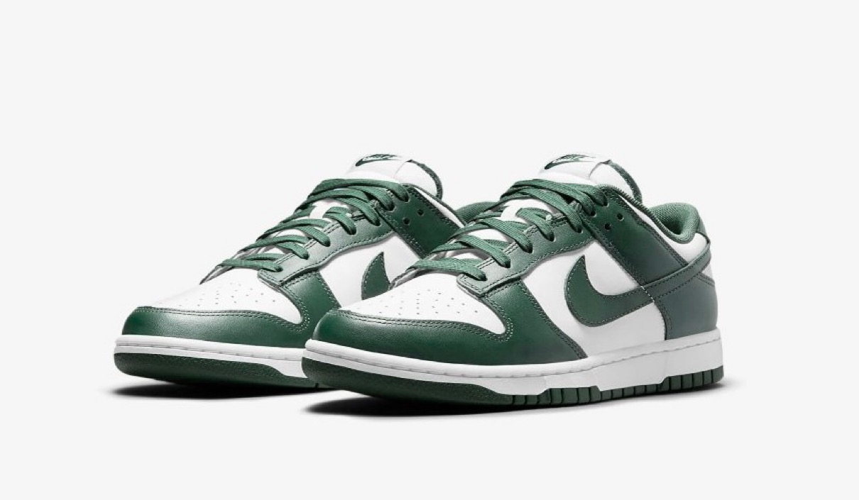 1985年に初めて発売され、昨年35周年を迎えた今、再び空前のブームを巻き起こしているナイキの人気スニーカー「ダンク」。本作ではホワイトカラーのレザー素材でアッパーを構築。オーバーレイやスウッシュロゴ、アウトソールには深緑のチームグリーンカラーを使用し、2020年9月にリリースされた Dunk High SP “Spartan Green”(ダンク ハイ エスピー “スパルタングリーン”)を彷彿させるカラーリングとなっている。また、本作はメンズサイズに加えキッズサイズ も展開予定。