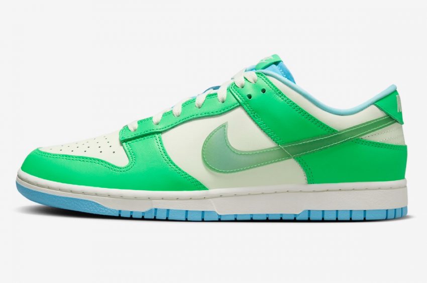 1985年に初めて発売されたナイキの人気スニーカー「ダンク(Dunk)」。新たに登場する本作ではローカットモデルをベースとし、アッパーをグリーンショック/セイルのレザー素材で構築し、ライナーやアウトソールにはアクアリウスブルーを使用している。