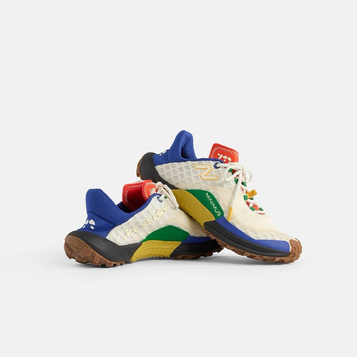 テクニカルメッシュのアッパーに落とし込まれたブルー、ホワイト、グリーン、オレンジのカラフルな色使いが特徴で大胆でステートメントメイキングなデザインを得意とするIce Studiosのセンスを物語っている。Minimusのロゴがインソールやシュータンを飾り、Ice Studiosのロゴがヒールとスポンジ状のタン上部にあしらわれている。