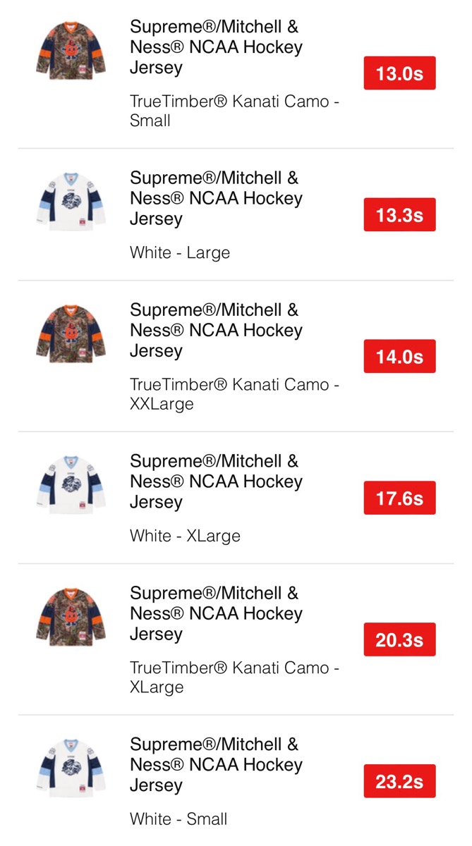 完売の早かったアイテムのサイズとカラーは上記の通り。Mitchell & Ness x NCAAコラボのホッケージャージは特に早い段階で売り切れる結果となった。