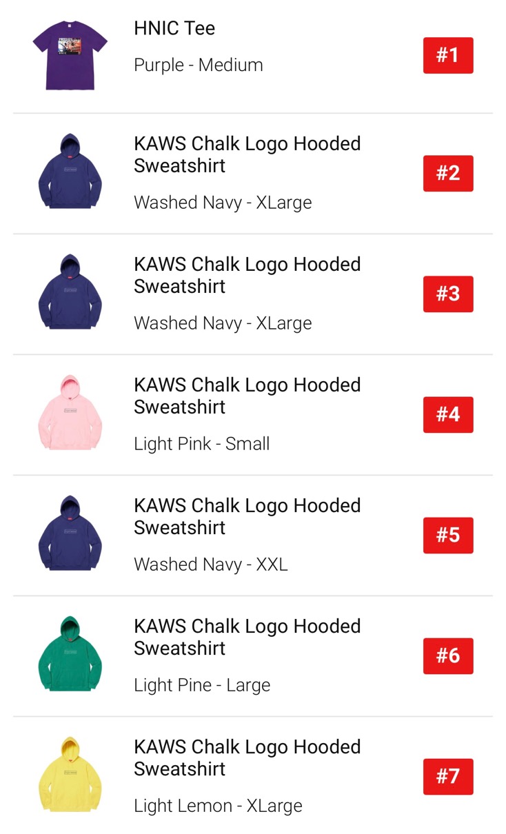 最速で完売したアイテムは、NYクイーンズブリッジ出身のヒップホップデュオ Mobb Deep(モブ・ディープ)のメンバーで、2017年に他界した 故 Prodigy(プロディジー)が2000年にリリースしたデビューソロアルバム『H.N.I.C.』のジャケットグラフィックを用いたTシャツのパープルカラーMサイズ。その後はカウズ チョークロゴフーディーや、バンダナファージャケット、各種Tシャツコレクションが早い段階で売り切れ。また、EU、USに続きAir Force 1(エアフォース1)のリストックも行われた。