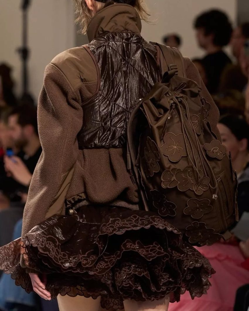 2025年春夏に続く今回も、ザ・ノース・フェイスのクラシックなアイテムを特徴的な花のディテールで再構築。メインカラーにはブラウンを使用し、各種アパレルやバックパックなど、セシリー・バンセンのアトリエで行われた実験とクラフトマンシップがここに記録されている。