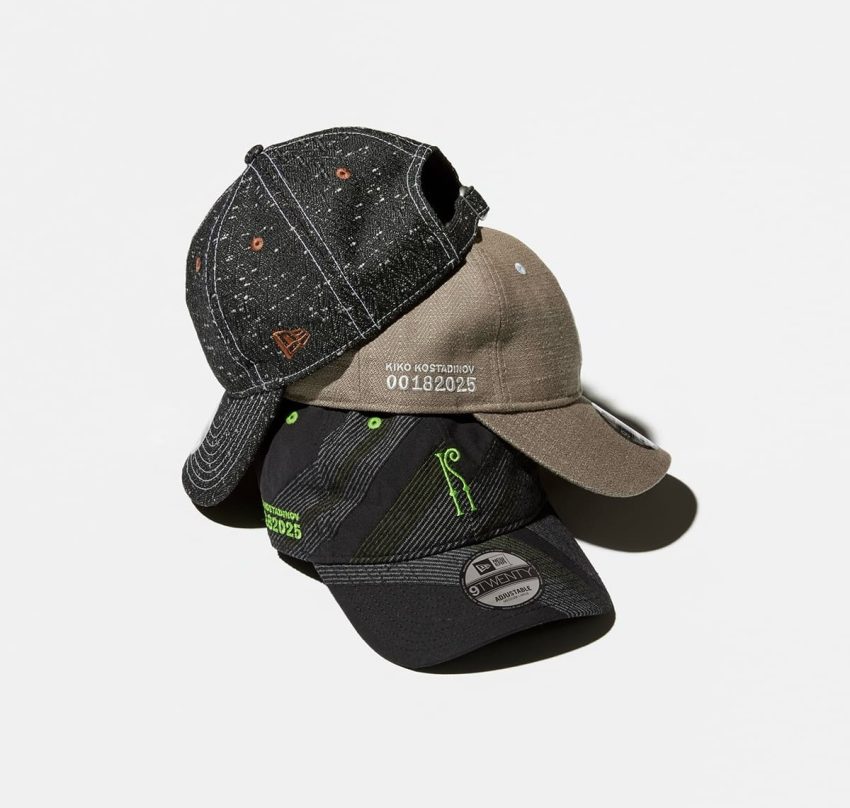 今回のコラボレーションでは、ニューエラの定番スタイル『9TWENTY』をベースに採用。昨年パリで発表されたKikoの2025年春夏メンズコレクションで象徴的だったピンストライプのコットン、ヘリンボーンウール、ジャガード生地をボディに採用した全3型がラインナップ。サイドにはKIKO KOSTADINOV独自のコレクションナンバリングを示す「00182025」が刺繍であしらわれた特別な仕様となっている。