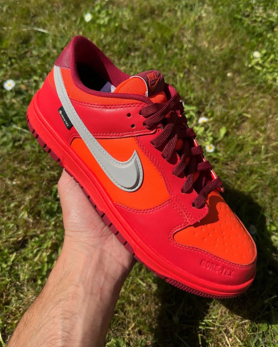 1985年に初めて発売されたナイキの「ダンク(Dunk)」。今回登場する新作は、アッパー裏地に防水透湿性素材(ぼうすいとうしつせいそざい)である「Gore-Tex®︎(ゴアテックス)」ファブリクスを採用した全天候型シューズ。レザー素材の表地にはクリムゾンレッド&オレンジのカラーリングを落とし込み、トゥボックスのベンチレーションホールなどは塞ぐことで、雨が染み込まないよう、防水性の高いディテールが施されている。