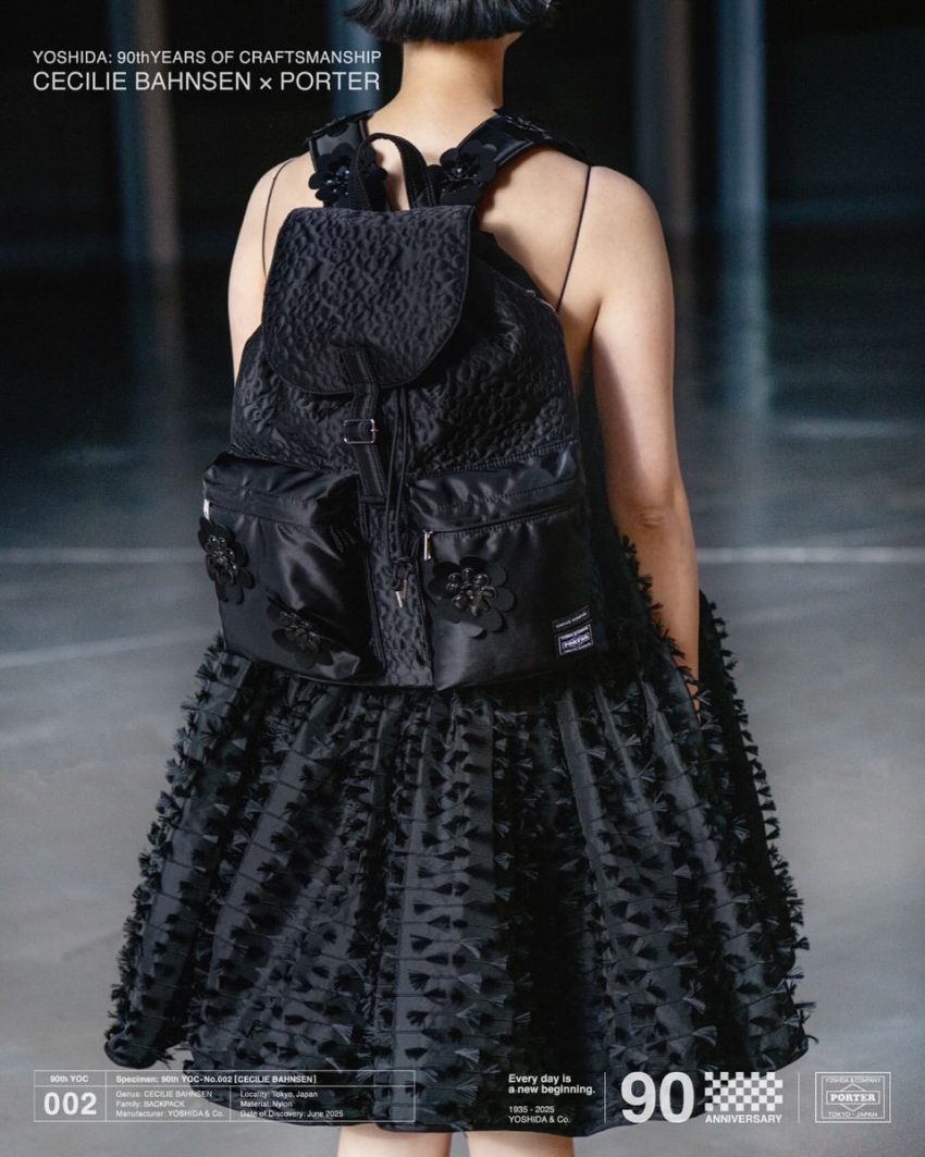 このコラボレーションは、両ブランドのクラフトマンシップや機能性、洗練されたデザインに共鳴し、PORTERを象徴する3つのシルエットをCECILIE BAHNSENならではの詩的な視点で再解釈している。キルティング刺繍を施したボンディングナイロンやレーザーカットによるフローラルモチーフ、エンボス加工のパテントアップリケなど、ロマンティックなクチュール感性が織り込まれている。