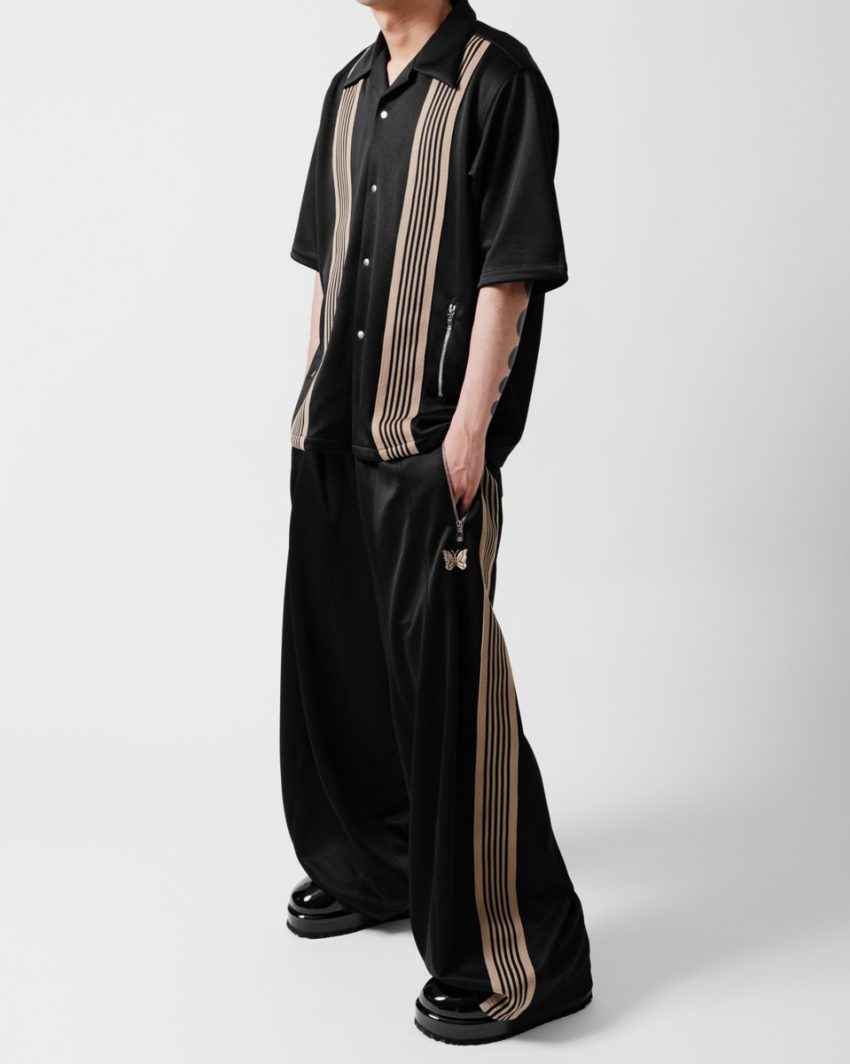 NeedlesとNUBIANによる今季の別注コレクションでは、フロントにテープを落とし込んだトラックシャツと、セットアップで着用できるワイドレッグのトラックパンツがラインナップ。販売は2024年6月18日(水)よりNUBIANオンラインショップで発売開始。