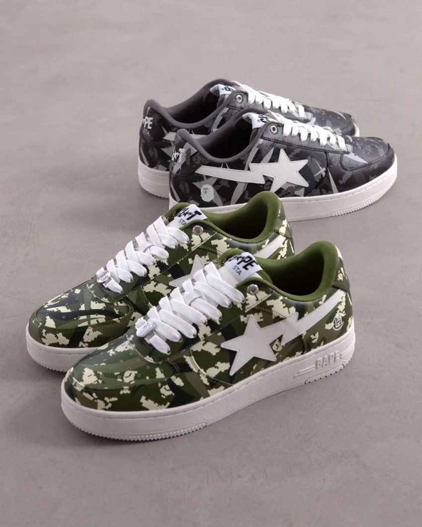 BAPE®とCLOTの新コレクションでは、BAPE®のDIGITAL CAMOとTRIAL CAMOを、CLOTのアイコン的なAlienegraパターンと融合させて落とし込んだTシャツ、トラッカーキャップ、BAPE STAスニーカーがラインナップ。デザインには大胆な3次元効果が施され、カモフラージュをシームレスに融合させることで、Alienegraのモチーフが浮遊する錯覚を生み出している。