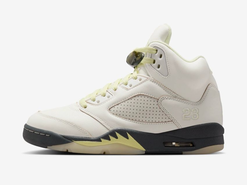 Michael Jordan(マイケル・ジョーダン)の5代目シグネチャーモデルとして1990年に初登場した「Air Jordan 5(エアジョーダン5)」は、第二次世界大戦中のアメリカ空軍戦闘機「P-51」通称“マスタング”からインスパイアされており、当時戦闘機の機首に多く描かれたサメの歯形のノーズアートをモチーフにしたミッドソールが特徴的な人気モデル。今回登場する一足では、アッパーを淡いセイル/ルミナスグリーンのレザー素材で構築し、ミッドソールはアンスラサイトで引き締めている。ヒールサイドはMJの背番号『23』、ヒールにはアイコニックなジャンプマンロゴを落とし込んだ。