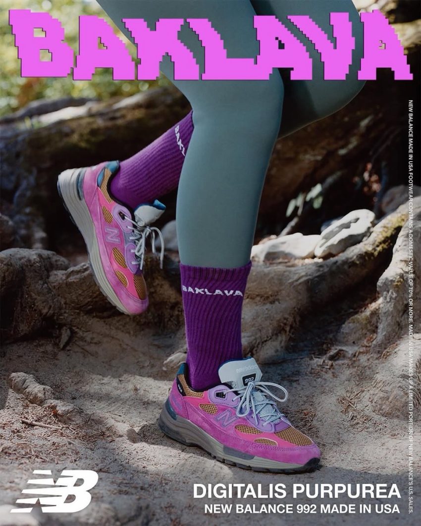今作では、2006年にNew Balanceの100周年を記念するモデルとして誕生し、今年ファン待望の復刻を果たした Made in U.S.A.「992」をベースに採用。カラーは“ジギタリスプルプレア”という花から着想したコズミックローズ/マゼンタといったピンク系。ヒールサイドにはBAKLAVAのロゴが刻印されている。