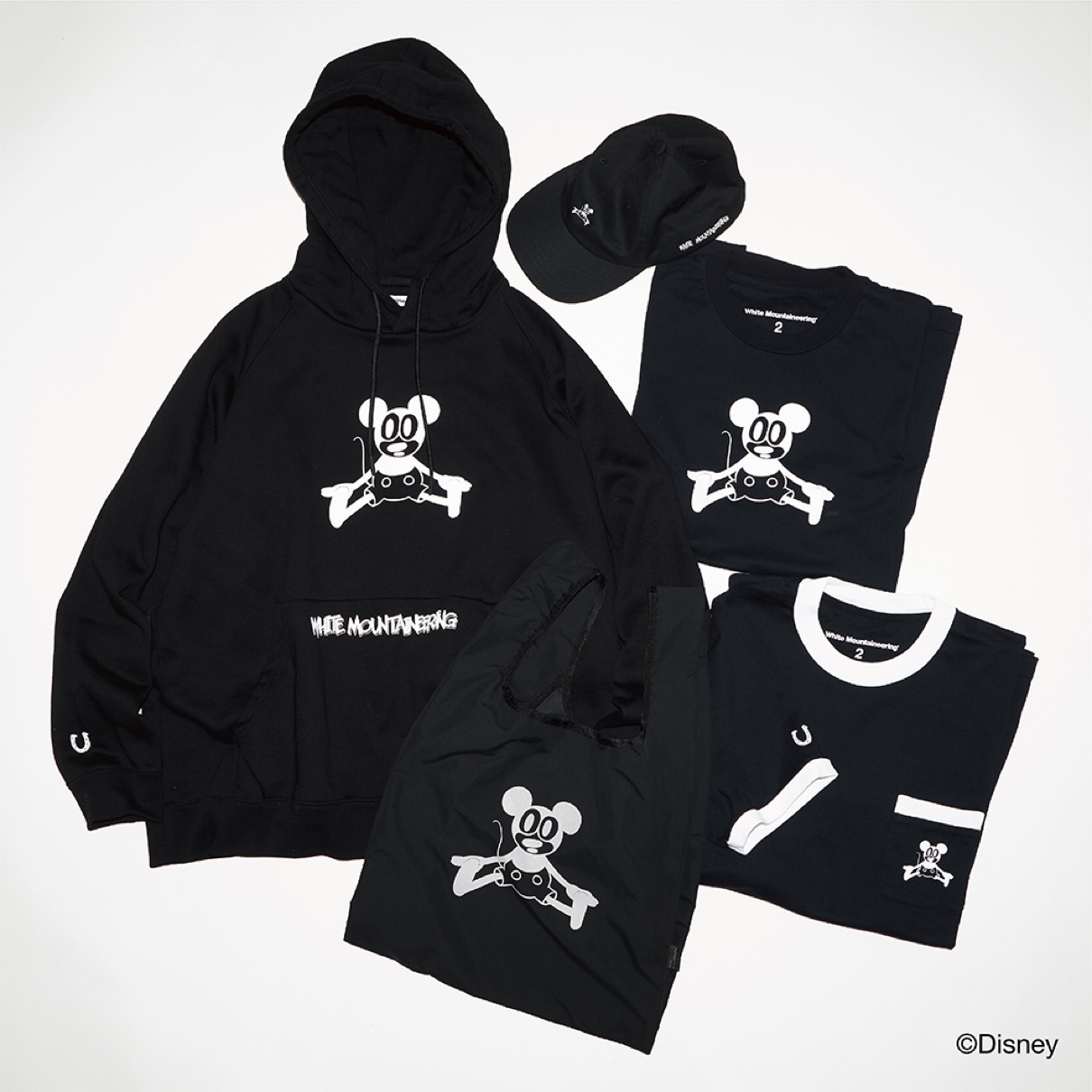 ホワイトマウンテニアリングからは、Rakuten Fashion限定販売のディズニーデザインアイテムカプセルコレクションが登場。ディズニーの最初期の1作品『プレーン・クレイジー』に登場するミッキーマウスのグラフィックを採用し、映画の世界観を再現するためモノトーンカラーで表現。WM定番のリラックスフィットのフーディースウェット、トートバッグ、Tシャツ、キャップがラインナップする。