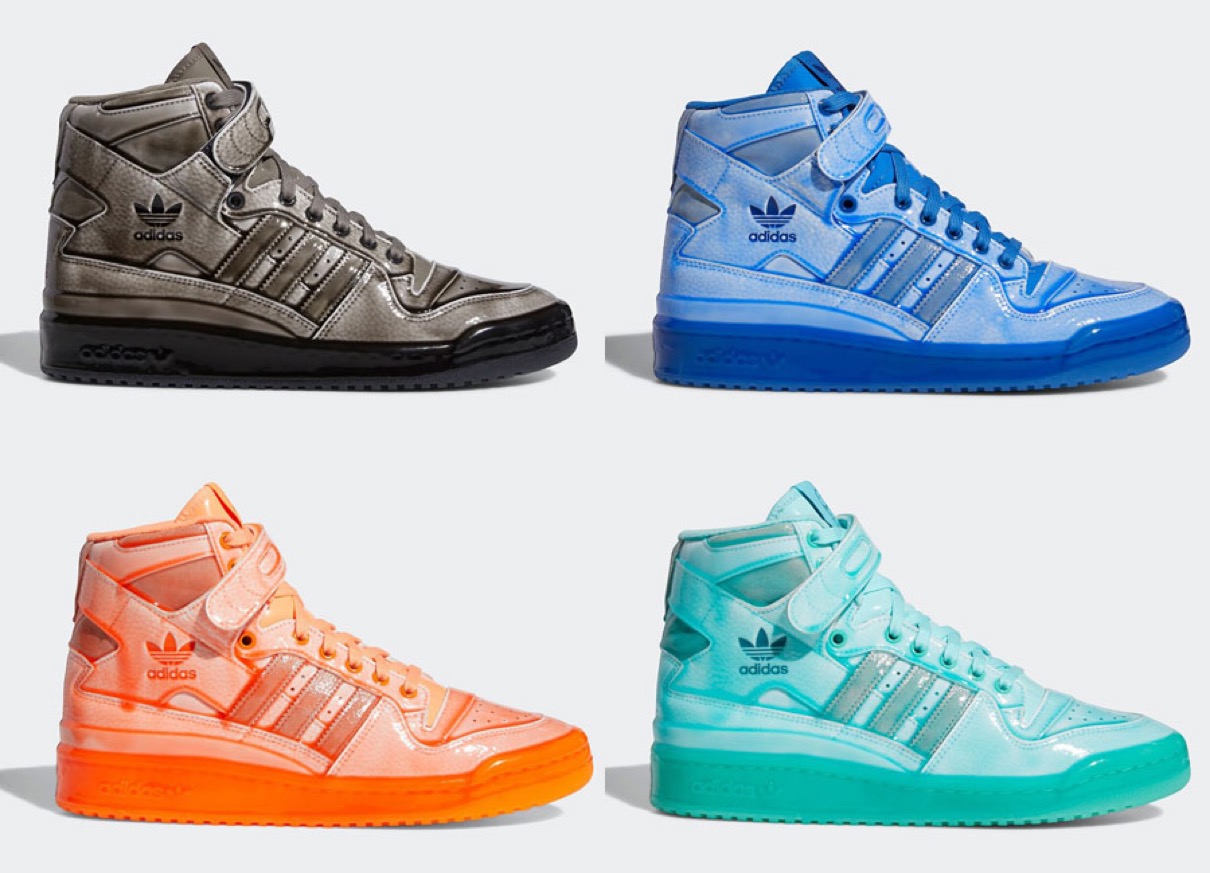 本作ではアディダスの人気バスケットボールシューズ「FORUM(フォーラム)」のロー&ハイカットモデルをベースに、それぞれアッパーに光沢のあるオレンジ、グリーン、ブルー、ブラック、イエロー、ピンクなどのワックスコーティングを施した。コーティングはあえて均一に塗らず色ムラが出るように仕上げられており、ジェレミー・スコットらしいユニークなディテールを備えた一足だ。